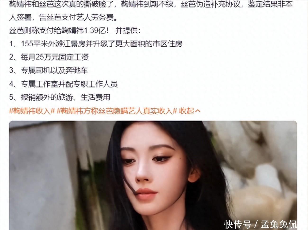 鞠婧祎与老东家丝芭传媒这算是彻底撕破脸了!丝芭传媒说2018年的时候与鞠婧祎签署补充协议,将原合约延长至 2033 年,还甩出两份单方委托的笔迹鉴定报告,坚称签名真实有效。但是鞠婧祎这方在2月、9月份的时候两次法院司法鉴定结果,都证明这个无法判断是本人所写,甚至说这个是伪造的。合约在24年6月份的时候就已经到期,续约根本是没有的事。丝芭又晒出十年间支付鞠婧祎税前 1.39 亿的明细,称这笔钱包含每月 25 万固定工资(用于上海落户)、1.6 亿《芸汐传》制作投入、奔驰房车和外滩江景公寓等福利。