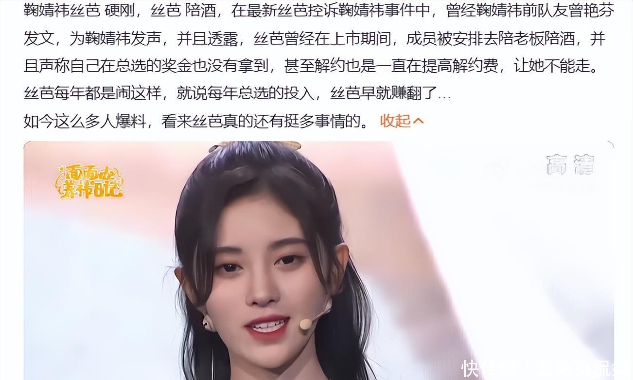 但现在不仅是鞠婧祎这一方回应说这个1.39亿是公司的结算款,本人只拿到了15%-20%,这个是低于行业标准的。而前队友曾艳芬也自曝百万片酬税后仅拿 9 万,总选奖金还被拖欠。现在又爆出说丝芭为了上市融资,安排部分成员陪酒的行为。